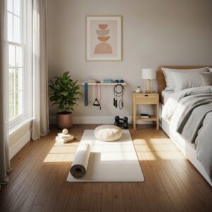 Adding a small plant or soft lighting enhances the calm atmosphere and encourages a mindful workout routine.