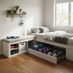 Similarly, beds with under-bed storage can store yoga mats, dumbbells, or resistance bands, keeping equipment out of sight when not in use.