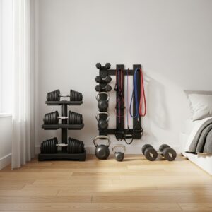 Vertical storage racks for dumbbells, resistance bands, and yoga blocks help maximize space.