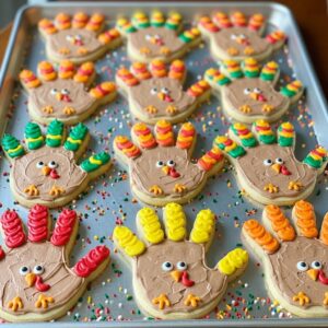 Simple sugar cookies turned into cute little turkeys using icing and candy.