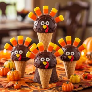 Cute turkey cupcakes baked inside cones for a fun twist!