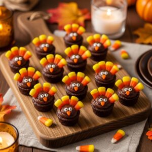 Mini brownies decorated like turkeys — bite-sized and rich!