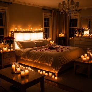 These scents promote relaxation and romance, making the room feel calm and emotionally inviting throughout the evening.