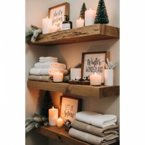 You can install simple wood shelves yourself and decorate them with winter-themed items like candles, folded towels, small signs, and greenery.