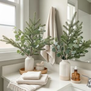 Use faux eucalyptus, pine branches, or frosted greenery in vases, wall planters, or small jars.