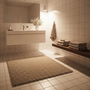 Choose a thick, fluffy rug or layered mats in neutral or earthy tones.