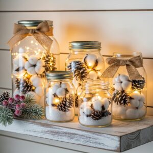 Fill them with cotton balls, pinecones, faux snow, or fairy lights. You can also paint the lids or wrap jars with twine for a rustic look.