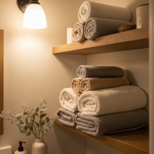 To make it feel more decorative, roll or neatly fold the towels and stack them on open shelves or in woven baskets.