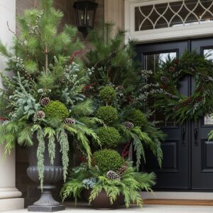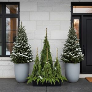 Combining multiple live evergreens in one planter creates depth and visual interest.