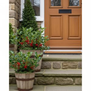 Holly plants add instant seasonal charm with their glossy green leaves and bright red berries.