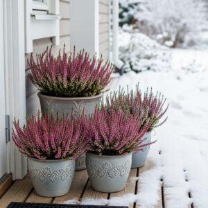 Heather does well in cooler temperatures and prefers acidic soil, making it an excellent option for sheltered front porches.