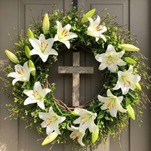 Lilies are strongly associated with Easter and resurrection, making them a meaningful choice for a cross wreath.