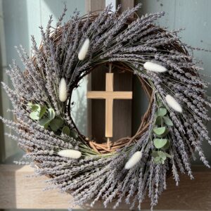 A lavender-wrapped cross placed on a grapevine or greenery wreath creates a calming and fragrant design.