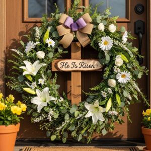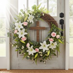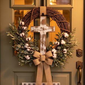 Finished with a simple bow or twine accent, this wreath blends faith with everyday home style, making it perfect for front doors throughout the Easter season.