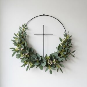 A thin metal cross placed inside a simple hoop wreath with eucalyptus or olive branches creates an elegant balance of faith and style.
