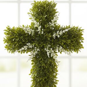 A faux boxwood cross wreath offers year-round durability while still fitting beautifully into Easter decor.