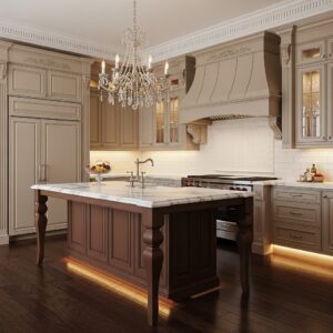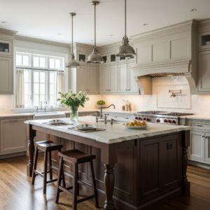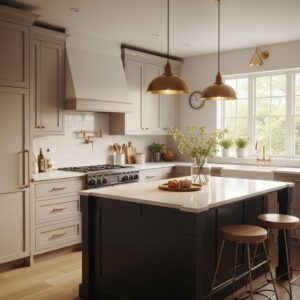 The combination of beige cabinets and a dark island is a powerful design choice that brings balance, warmth, and sophistication to your kitchen.