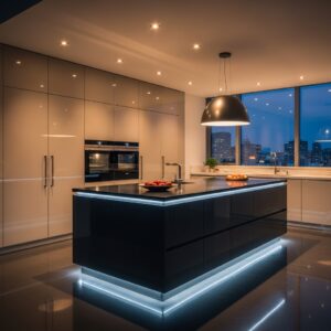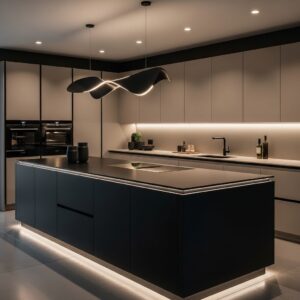 Add under-cabinet lights or LED strips under the island to enhance the depth between the beige cabinets and the dark island base.