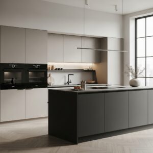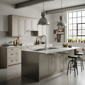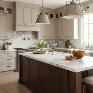 When paired with taupe beige cabinets, the look becomes modern, grounded, and incredibly high-end. Add minimalist lighting for a sleek finish.