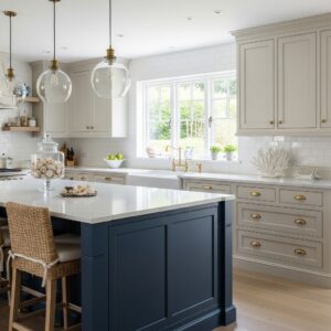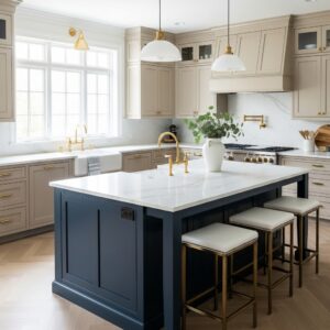 4. Creamy Beige Cabinets with a Deep Navy Island