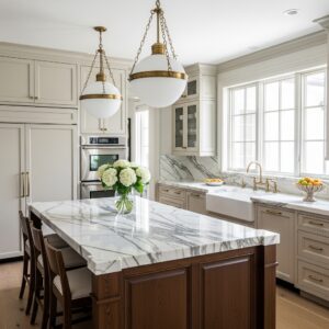 This warm combination works beautifully in both traditional and modern kitchens, especially when styled with creamy quartz countertops.