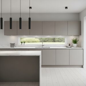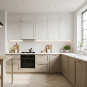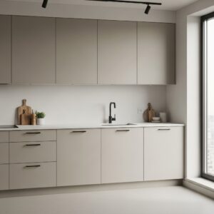 For a sleek, minimalist kitchen, choose flat beige cabinetry paired with matte white quartz or solid-surface countertops.