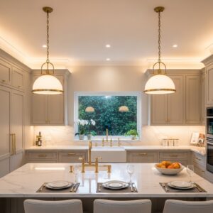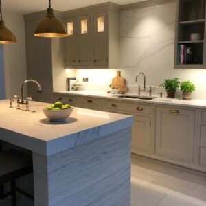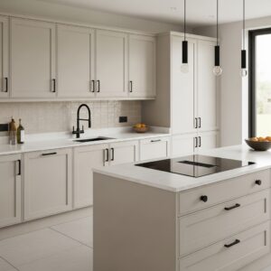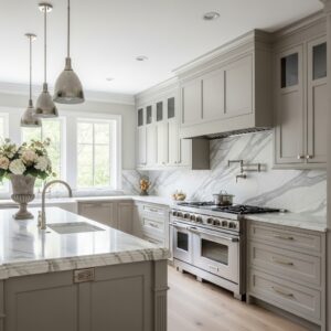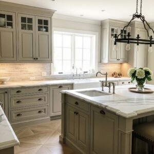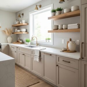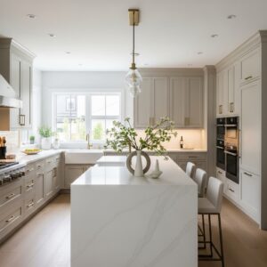Greige (gray + beige) cabinets paired with bright white quartz give your kitchen a fresh, modern, and slightly cool-toned aesthetic.