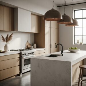 The pairing is earthy yet contemporary, making it perfect for artistic or minimalist kitchens.