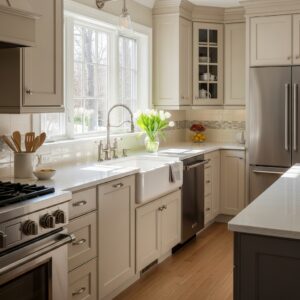 Beige cabinets with white countertops create one of the most versatile and timeless kitchen combinations.