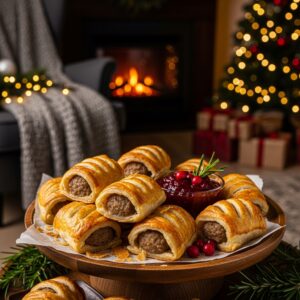 Perfect Christmas appetizers — flaky pastry wrapped around juicy sausage meat.