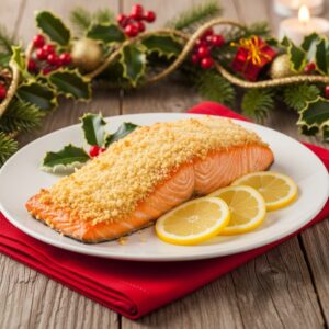 A rich and flaky salmon dish topped with a golden parmesan crust — ideal for Christmas Eve dinners.