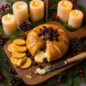 Melted gooey brie wrapped in puff pastry, topped with honey and cranberries — a luxurious Christmas appetizer.