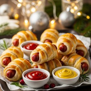 Wrap sausages in dough, bake until golden, serve warm with ketchup or mustard.