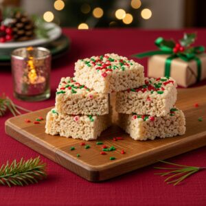 Melt butter and marshmallows, mix with cereal, press into pan, decorate with sprinkles, cut into squares.
