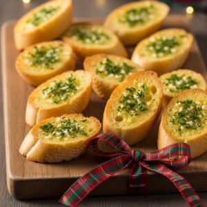 Slice bread, brush with garlic butter, bake until golden, sprinkle parsley, and serve.