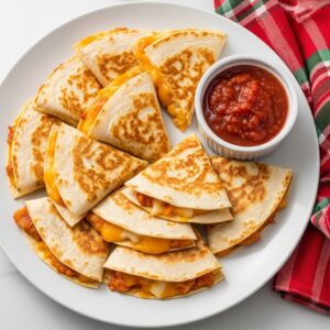 Fill tortillas with cheese, cook on a skillet until golden, cut into small triangles, serve warm.