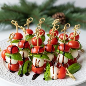 Skewer tomato, mozzarella, and basil, drizzle balsamic glaze, serve.