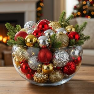 Take a decorative glass bowl, cake stand, or wooden tray and fill it with ornaments of different sizes, textures, and colors.