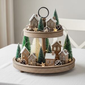 Fill each level with ornaments, pinecones, mini houses, or bottle brush trees.