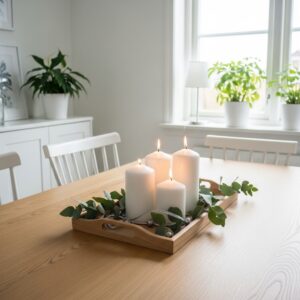 Use a simple wooden tray, white candles, and fresh greenery like eucalyptus or pine.