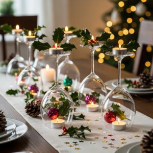 Flip wine glasses upside down and place ornaments, pinecones, or sprigs of holly inside the bowls.