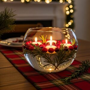 For a simple yet elegant centerpiece, fill a glass bowl or vase with water, add fresh cranberries, and place floating candles on top.