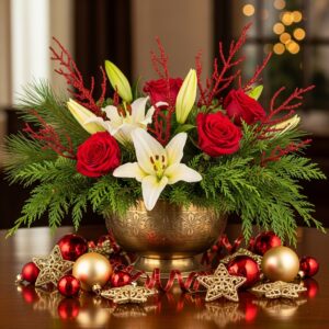 This elegant centerpiece blends traditional beauty with holiday cheer.