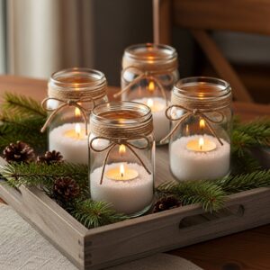 Group several jars of varying heights together on a tray to create a rustic, glowing centerpiece that works well for farmhouse-style décor.