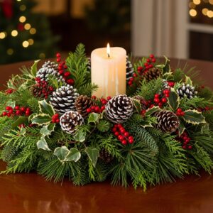Choose a wreath style that matches your table décor—whether it’s simple greenery, frosted pinecones, or glittery accents.