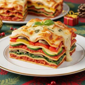 This meat-free lasagna is layered with vegetables, cheese, and rich tomato sauce.