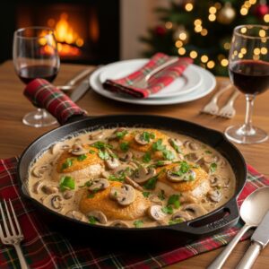 Tender chicken cooked in a creamy mushroom sauce makes a rich and comforting holiday meal.