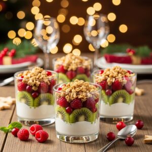 These parfaits look festive, require zero cooking, and give a healthier balance to sugary holiday treats while still feeling fun and celebratory.