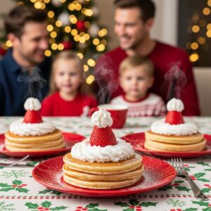 Make simple pancakes, then decorate each with whipped cream and sliced strawberries to create cute “Santa hats.”