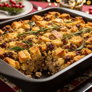 A savory crowd favorite with sausage, herbs, and toasted bread cubes. It pairs well with almost any Christmas main dish.